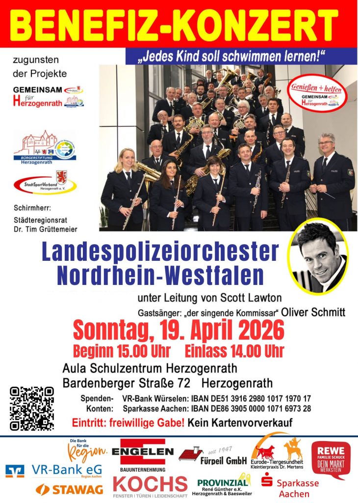 Das BENEFIZ-KONZERT zugunsten „Jedes Kind soll schwimmen lernen!“, eines der Projekte „GEMEINSAM für Herzogenrath„, der Bürgerstiftung-Herzogenrath und des StadtSportVerband Herzogenrath findet am Nachmittag des 19.April in der Aula des Städtischen Gymnasium Herzogenrath Bardenbergerstraße 75. statt.